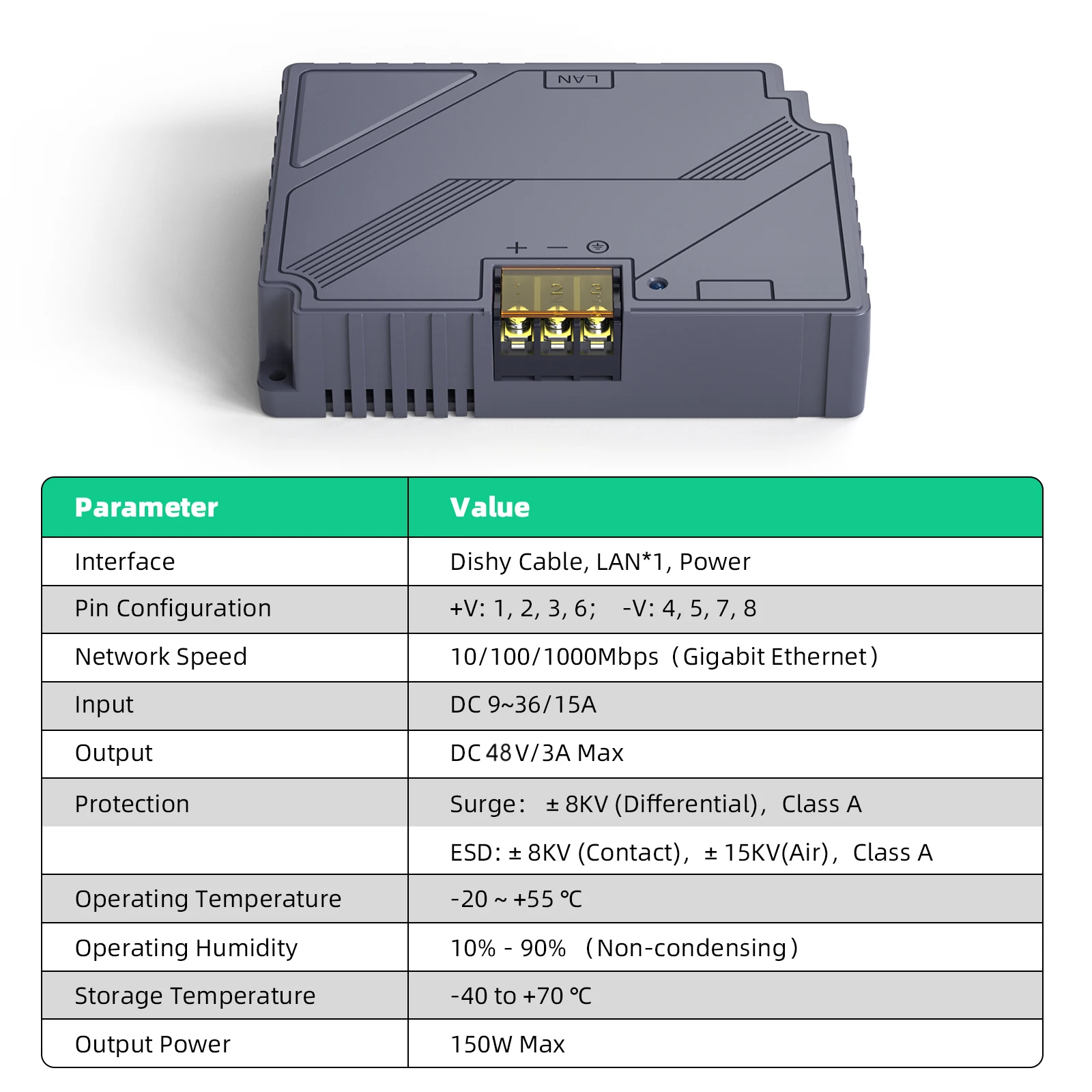 Robust Protection and Environmental Resilience 150W Starlink 12V Poe Offers superior surge and ESD protection, efficient storage capabilities ensure reliability and longevity.