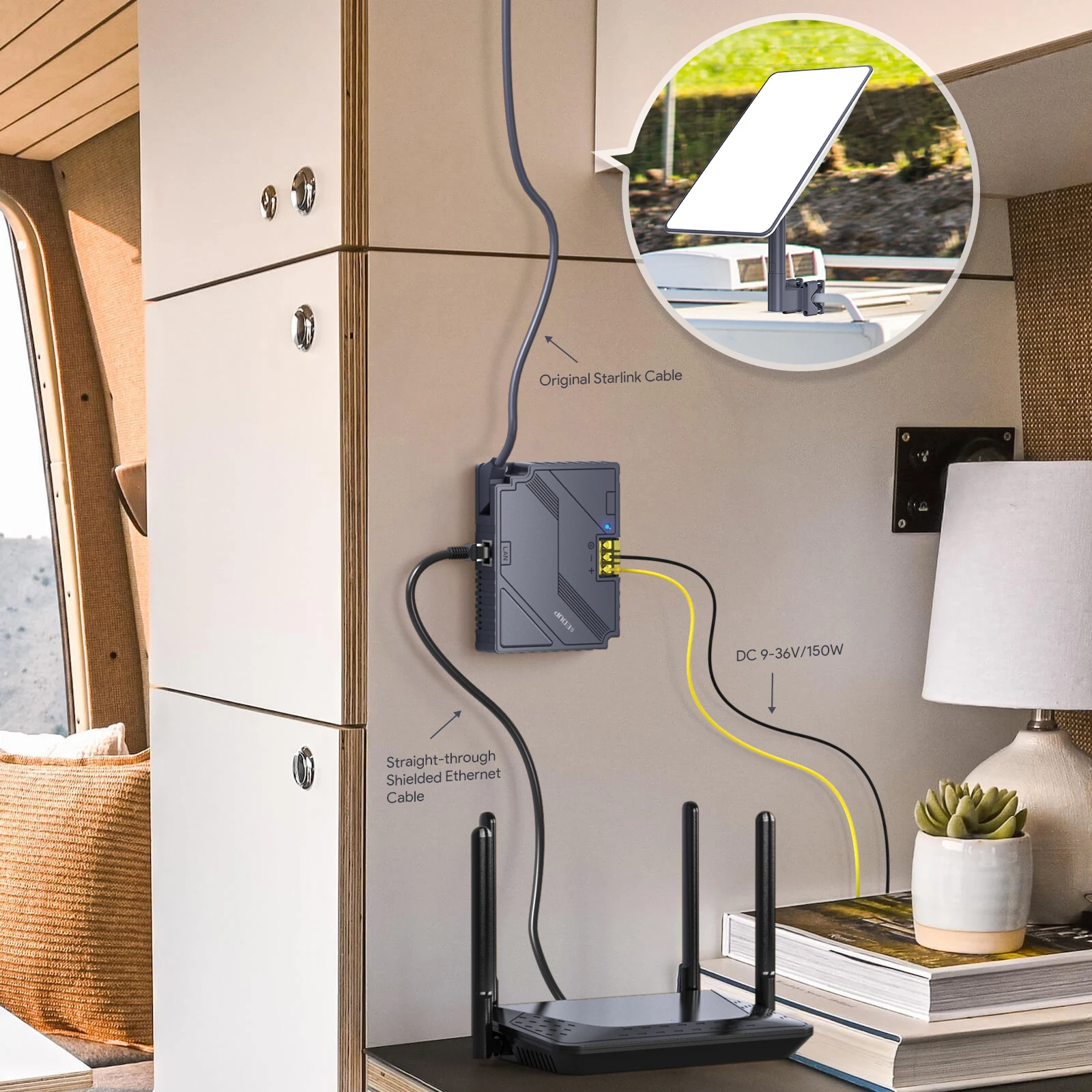 Experience seamless internet access on the road with our 3 in 1 Starlink Gen 2 Step Up PoE Injector 150W with Comprehensive Protection for Starlink Standard Actuated, perfectly integrated into your RV setup.