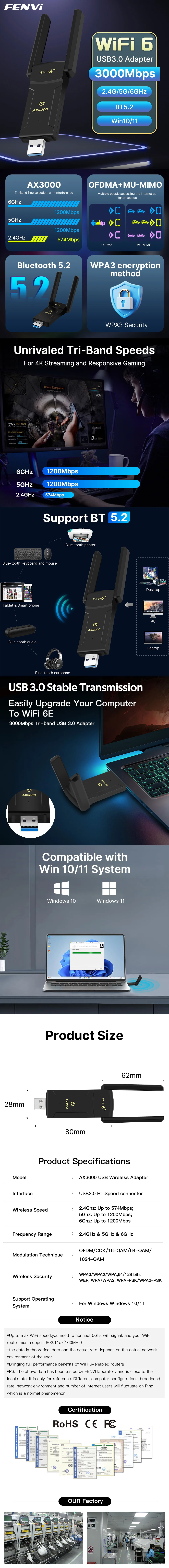 FENVI AX3000 BT 5.2 WiFi 6E USB WiFi Dongle USB3.0 WiFi Adapter 2.4G/5G/6GHz 802.11AX Network Wireless Receiver For PC Win10/11